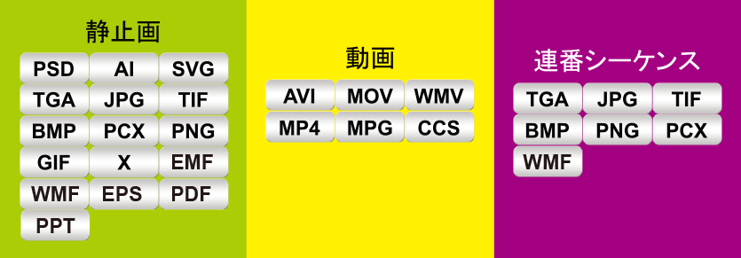 MOV、TGA、PNG、JPG、BMP。静止画・シーケンス共に可。