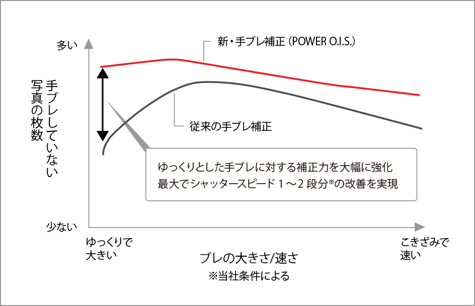 レンズ筐体内に搭載したジャイロセンサーが、手ブレを検知して補正する「POWER O.I.S.」を搭載。毎秒4000回のブレ検知を行うことで、高周波域(早く小刻みな手ブレ)だけでなく、低周波域(大きくゆっくりとした手ブレ)の手ブレも検知して補正します。