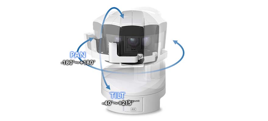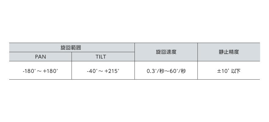パン動作範囲 : 水平 ±180° チルト動作範囲 : 垂直 -40° ~ +215° 旋回速度 0.3° ~ 60°/秒 |