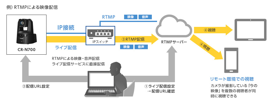 CR-N700は、RTMPによる映像・音声のストリーミングによる配信が可能。放送番組などの高画質/大容量の映像・音声ファイルであっても、ダウンロードの完了を待たずに、配信と同時に再生されます。また、高セキュリティ環境下での通信に適したRTMPSにも対応しています。