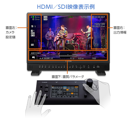 ハードコントローラ操作時に有効な、HDMIまたはSDI接続されたモニター上へOSD情報の重畳表示のON/OFF設定が可能。