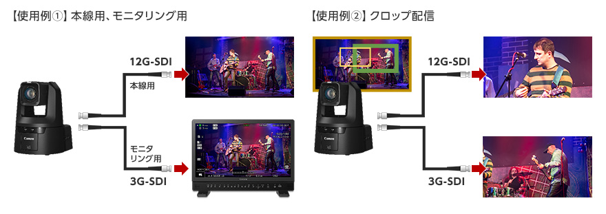 ケーブル1本で4K 60P映像を配信できる、12G-SDI出力端子を搭載。3G-SDI端子とあわせ、2系統の映像を同時出力することが可能になりました。