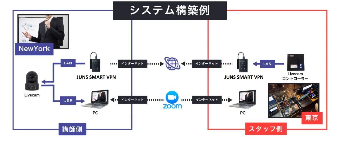 JUNSのSMART VPNとzoomなどのビデオチャットを組み合わせて、海外などの離れた場所にあるカメラを操作できるシステムを簡単に構築できます。