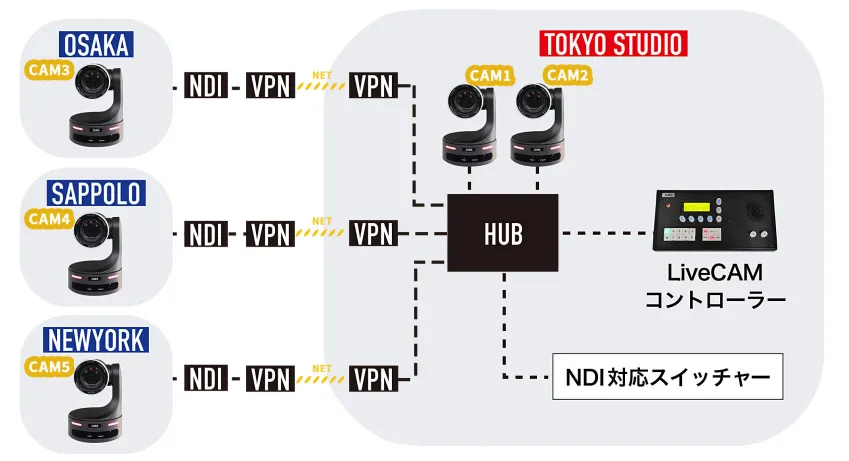 大阪、札幌、ニューヨークそれぞれにSMART VPNのペアを用意いただき、東京スタジオにあるVPNを同じハブに接続することで、各拠点にあるカメラの映像と制御を同列にコントロールすることが可能となります。