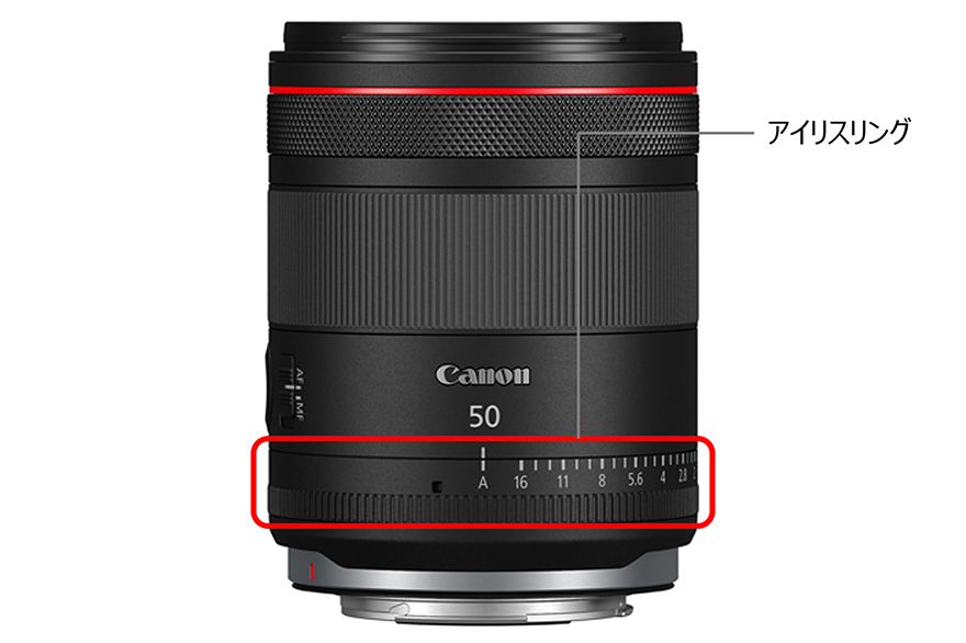 動画の撮影中に絞りをマニュアルコントロール可能な「アイリスリング」を採用し、RF35mm F1.4 L VCMと共通の操作系としました。クリック感のないなめらかな絞りコントロールが可能で、CINEMA EOS SYSTEMのシネマレンズと回転方向を揃えているため、動画撮影の現場でも違和感なく操作が可能です。