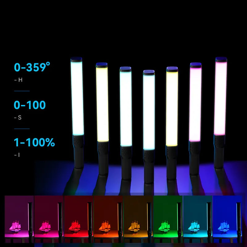 Light Stick VL360 RGBは、HSIモードを搭載し、お好みの色にフルアクセスできます。色相は0°~359°、彩度は0%~100%、明るさは0%~100%で調光可能。
