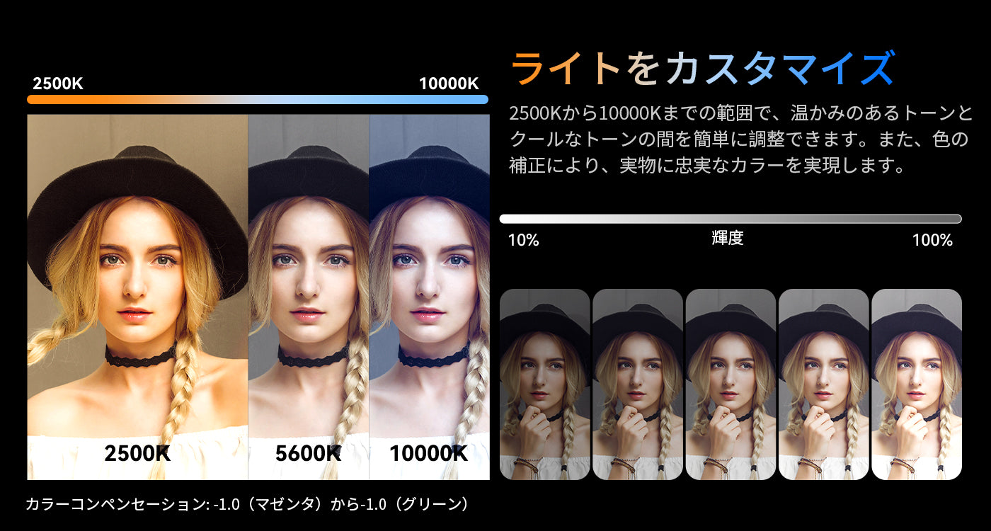 ライトスティックVL360は、2500K~10000Kの色温度を正確に調整できるCCTモードを搭載し、0%~100%の調光が可能です。CRI 94+の優れた演色性で、自然で鮮やかな色を幅広く保証。内蔵LCDによる正確な読み取りで、色を完璧に合わせます。