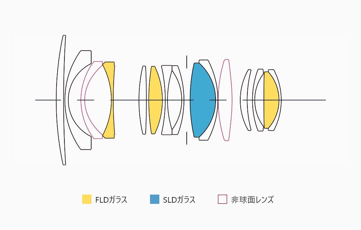 フルサイズ用大口径レンズ並みの13群16枚という贅沢なレンズ構成に、FLDガラス3枚と、SLDガラス2枚、グラスモールド非球面レンズ2枚を採用。