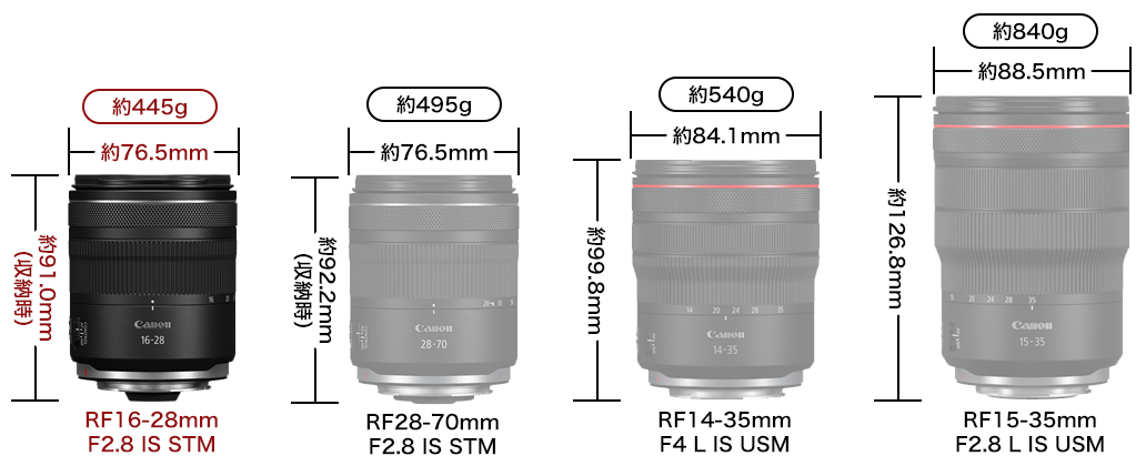 大口径F2.8通しのズームレンズシリーズの、RF28-70mm F2.8 IS STMとほぼ同等の大きさと重さを実現。