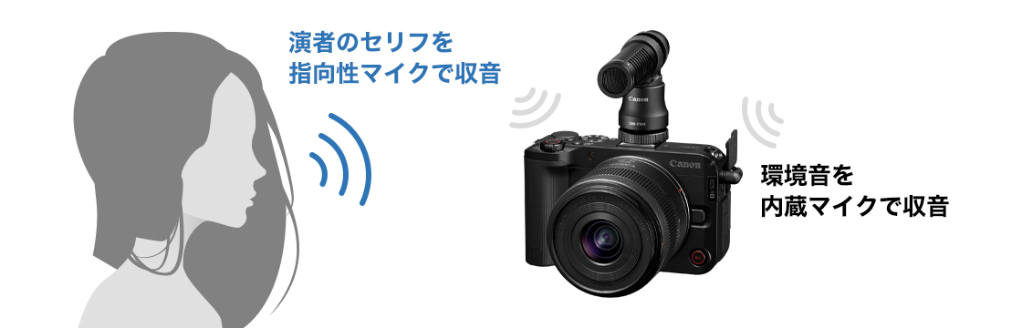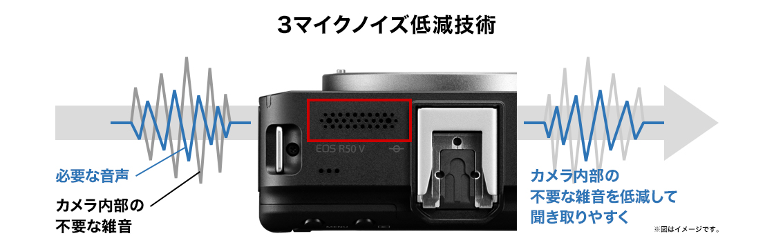 音声入力用のステレオマイクに加え、AF時のフォーカス駆動ノイズを検出し低減する第三のマイクを内蔵した3マイクシステム。また、ホワイトノイズ(フロアノイズ)を低減する音声処理技術も採用しました。