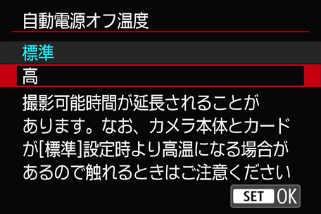 [自動電源オフ温度:高]設定時は、手でつかむ箇所の温度制限を緩和します。その場合、三脚などを使用して撮影を行ってください。