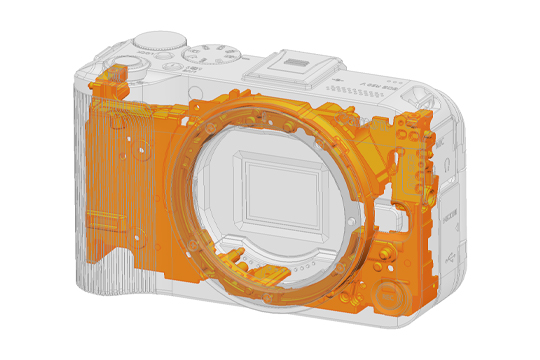 EOS R50 Vは、シネマカメラにも採用されている、放熱性の高いマグネシウム合金をボディー内部に使用しています。外装には主にガラス繊維入りのポリカーボネイト樹脂を採用し、カメラの堅牢性を確保しながら、長時間撮影を支える熱拡散を考慮した設計になっています。