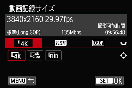 | YCbCr 4:2:2 | 10bit | 4K Crop、4K:3840 × 2160 | 標準 LGOP | 59.94/50.00(4K Crop) | 225Mbps (4K Crop) |