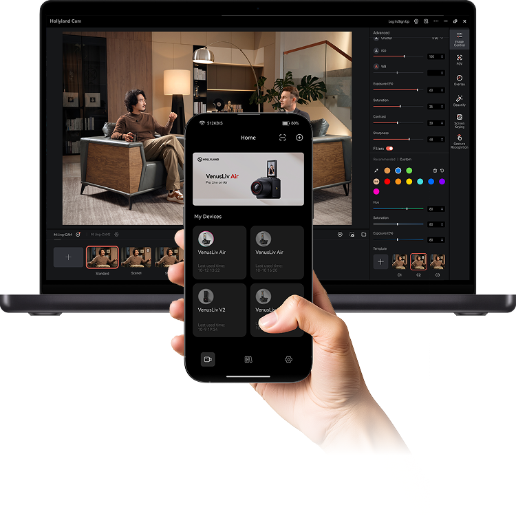 モバイルアプリ「VenusCam」やPCソフト「Hollyland CAM」から、遠隔でライブフィードのモニタリングや各種カメラ操作が可能。