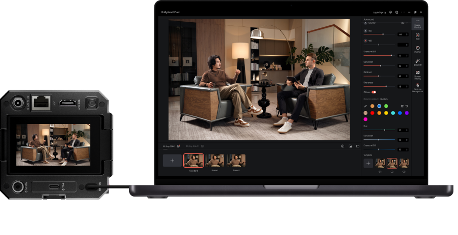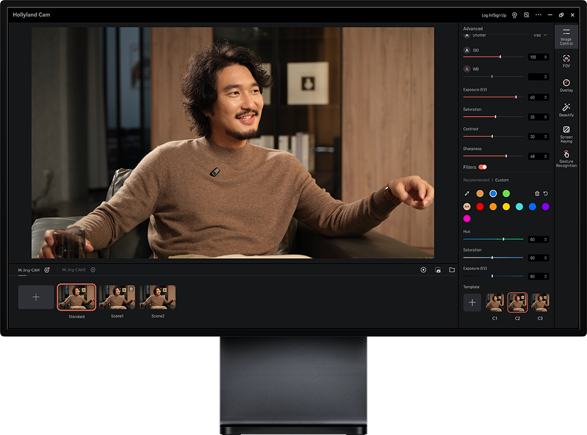 Hollyland CAM(PC):グリーンスクリーン、画像オーバーレイ、スキンビューティー、カラー補正、モニタリング、録画など多機能を提供