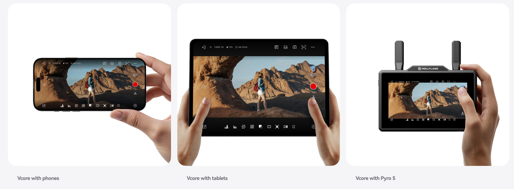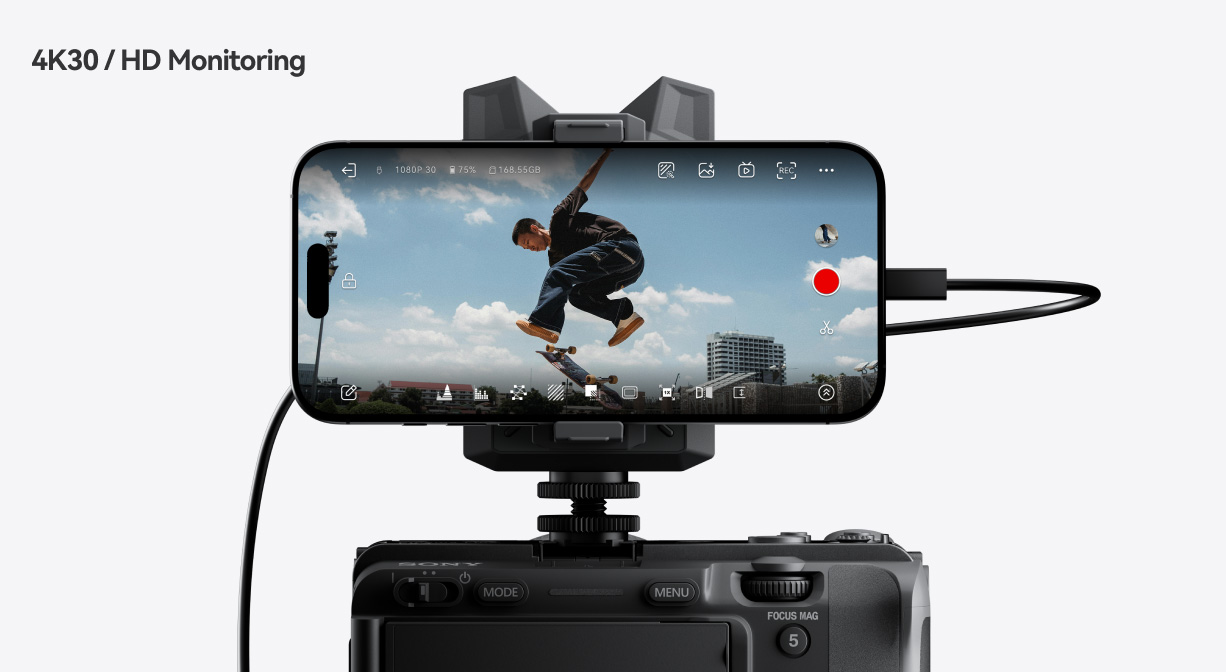 4K30fpsの高精細な映像を手のひらサイズのモバイルデバイスでモニタリングでき、HollyViewアプリとの連携により、スマートフォンやタブレットが即座にプロ仕様のポータブルモニターとして機能します。