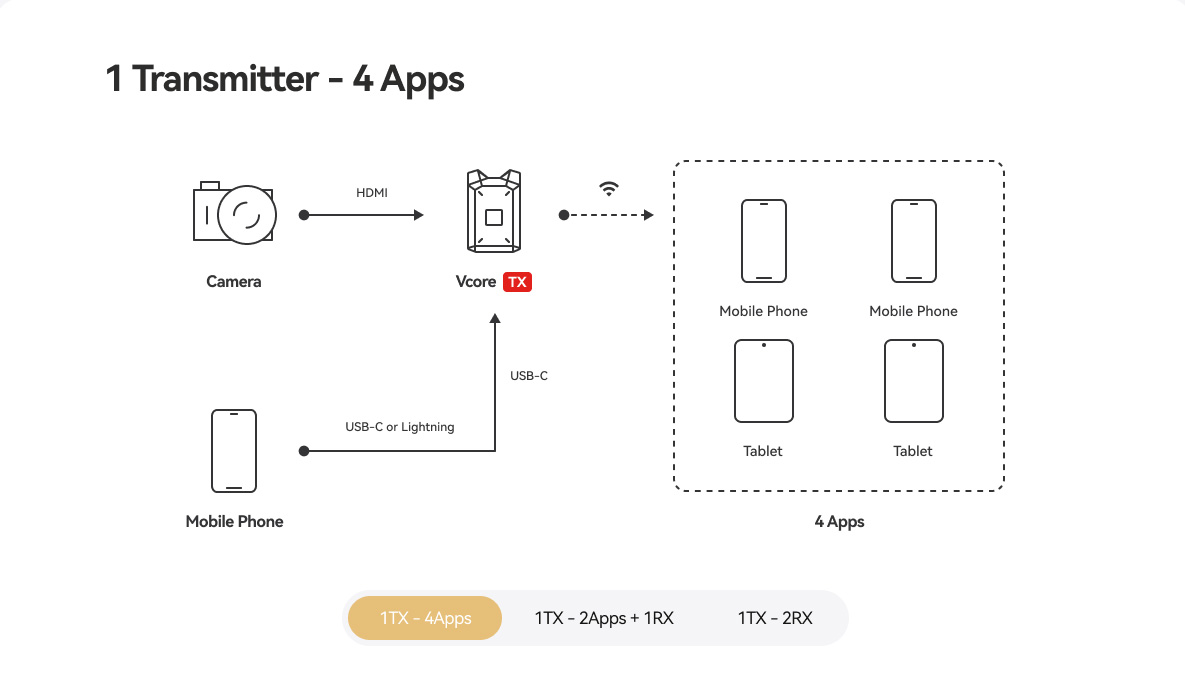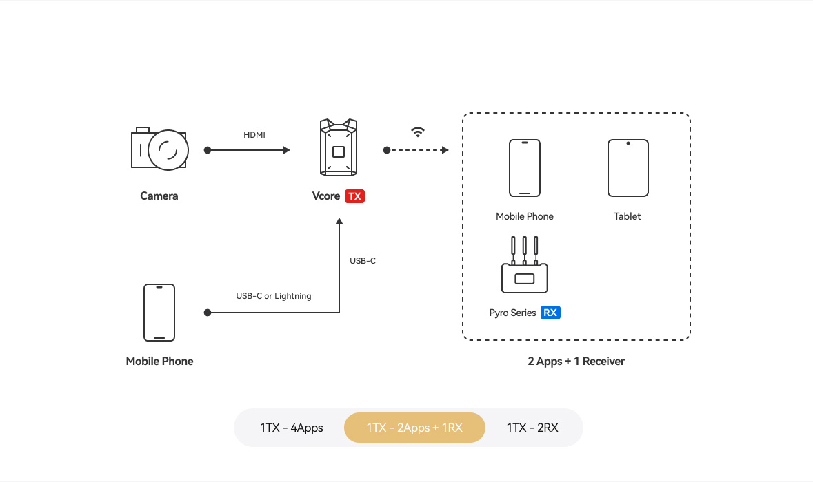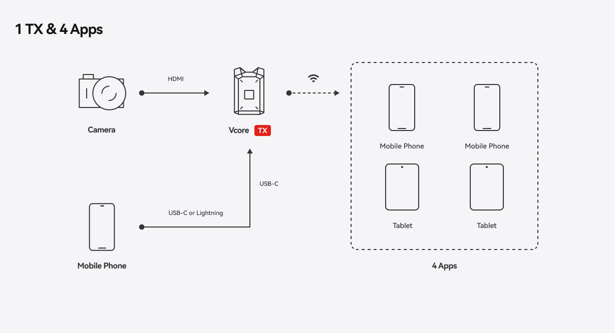 Vcoreは、カメラとはHDMIによる有線接続、スマートフォンやタブレットとはWi-Fiによるワイヤレス接続に対応しています。
