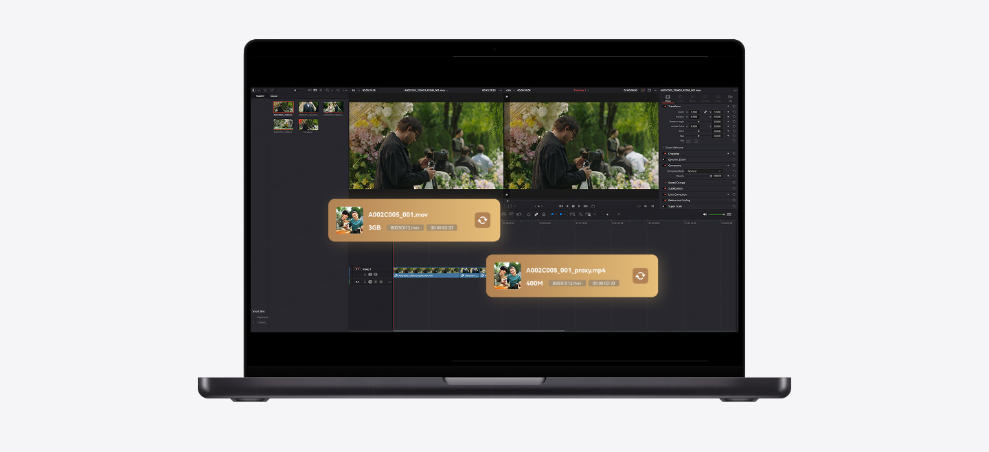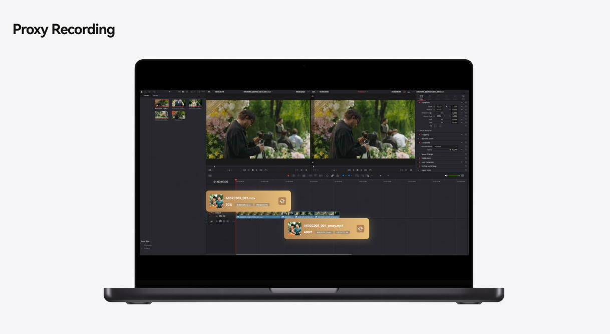 最大1080p・60fpsでH.264形式による録画が可能。撮影時に自動的にフレームレートとタイムコードを検出し、Premiere ProやDaVinci Resolveなどの主要編集ソフトとシームレスにリンクできるプロキシファイルを生成します。
