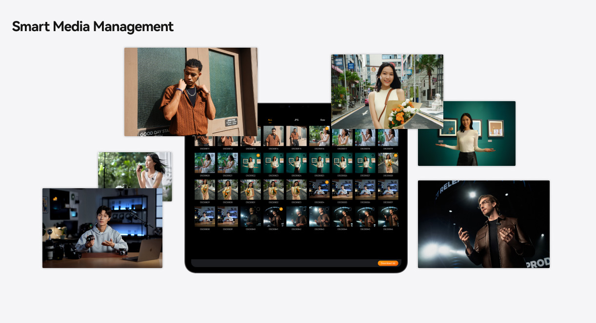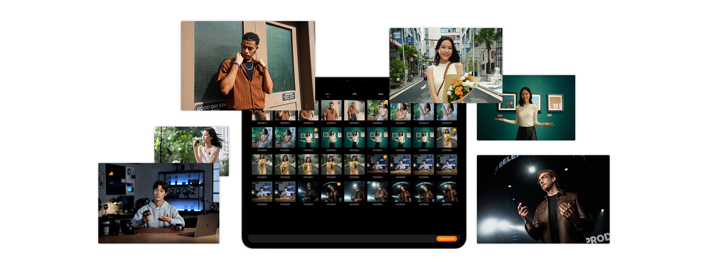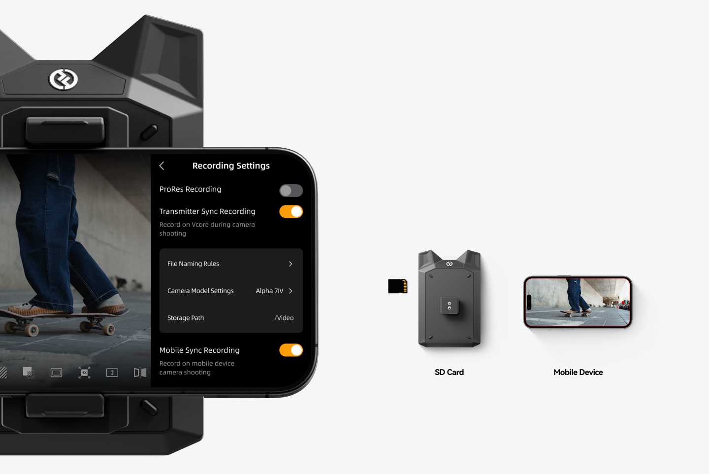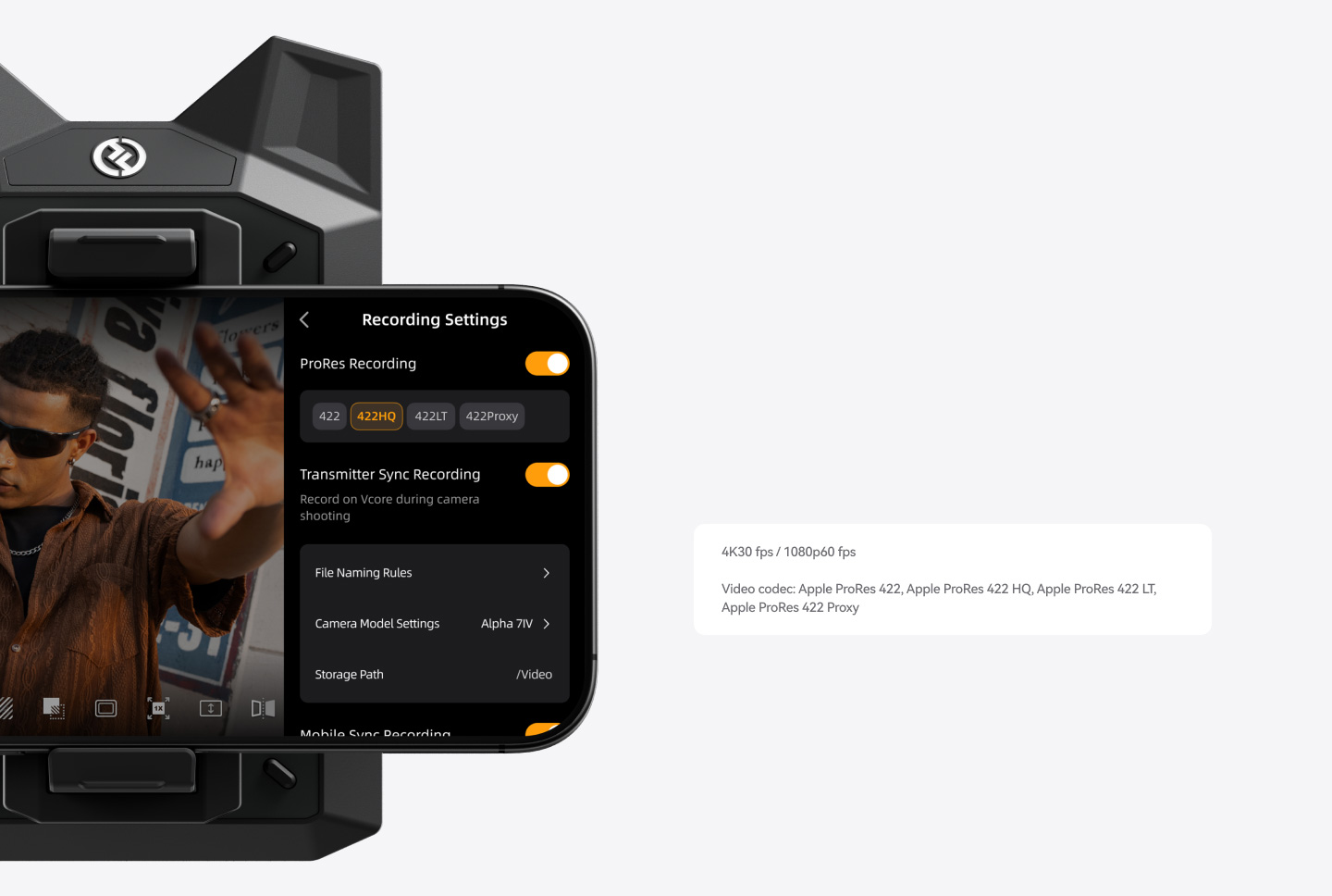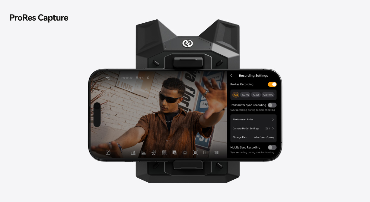 送信機およびモバイルデバイス上のファイルは共通のファイル名プレフィックスを保持し、編集時のファイル管理が容易になります。録画は最大1080p/60fpsに対応。