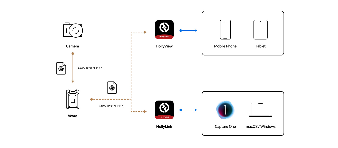 カメラとUSB[6]で接続されたVcoreは、RAWやJPEGなどの非圧縮高解像度画像ファイルを撮影と同時にキャプチャし、HollyViewアプリ経由でモバイルデバイスにリアルタイム転送。さらに、HollyLink(Capture One用プラグイン)を使って、macOSまたはWindows PCにも即時転送が可能です。