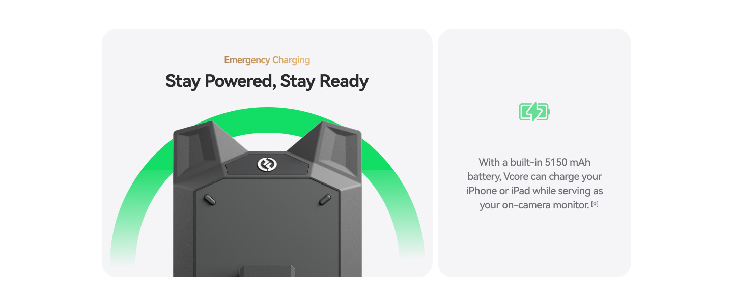 Vcoreは内蔵の5150mAhバッテリーを使用して、オンカメラモニターとして動作しながら、iPhoneやiPadへの給電にも対応しています。